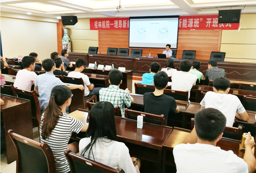 簽約儀式結(jié)束后,桂林航天工業(yè)學(xué)院舉行了“理昂新能源班”開班儀式。郭振軍對有志于“理昂新能源班”學(xué)習(xí)的同學(xué)們表示歡迎和贊賞,他向同學(xué)們詳細介紹了理昂公司的發(fā)展歷程、運行機制,以及“節(jié)約資源、造福社會、美化環(huán)境”的企業(yè)使命。